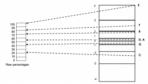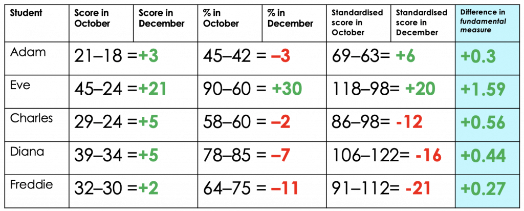 Adapted from Deep Ghatuara's researchEd talk, Fundamental Measurement for Schools[/caption]Now it looks like only Eve has made progress and that everyone else is in free fall, with Diana and Freddie in need of urgent intervention. If we convert these percentages into standardised scores, things become even more confusing: