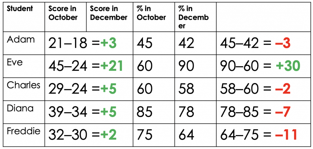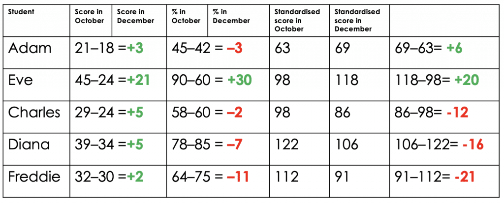 Adapted from Deep Ghataura's researchED talk, Fundamental Measurement for Schools[/caption]All five students took a test in October and then a second test two months later. When we subtract the first test score from the second we can see how much progress each individual student has made. Although Eve is clearly out performing her classmates by a considerable margin, all have seen their scores increase so we can be quietly confident that all have made progress. But what happens if we turn the students' raw marks into percentages?