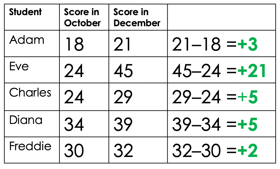 Adapted from Deep Ghatuara's researchEd talk, Fundamental Measurement for Schools[/caption]Now we can finally see how much actual progress has been made from the first assessment to the second. Eve really is doing brilliantly and everyone else has made some progress. MAybe we should be concerned about the relatively slow pace of progress shown by Freddie and Adam, but, as long as we keep an eye on them over the coming months, there's probably no need for immediate concern.