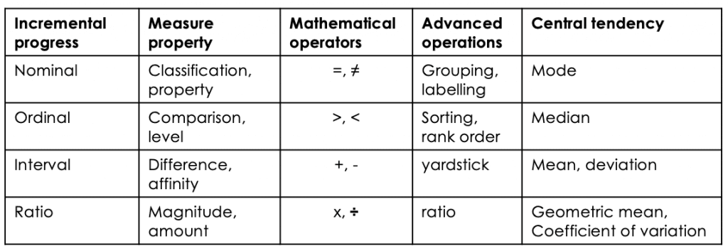 Table 4: Stevens' level of measurement[/caption]Nominal measurement is simply a means of determining whether a thing is a member of a group. Nominal measurement would include dividing students into boys and girls and pupil premium and non pupil premium. All we're able to calculate is the most frequently occurring type. Ordinal measurement allows us to compare two things and judge which is x > y? (none/some/more/all). This is how judging using a comparative judgement algorithm works (more on that later). Interval measure allow us to work out where something is along a scale and establish the degree of difference between x and y. For instance, the Celsius temperature scale is divided into regular intervals between the freezing point of water (0°C) and its boiling point (100°C.) However, ratios are not meaningful as the zero point of the scale is arbitrary so that it's impossible to state that 40°C is twice as hot as 20°C. By the same token, neither is it possible to say that a student who scores 60% in a test has done twice as well as a students who scores 30%.