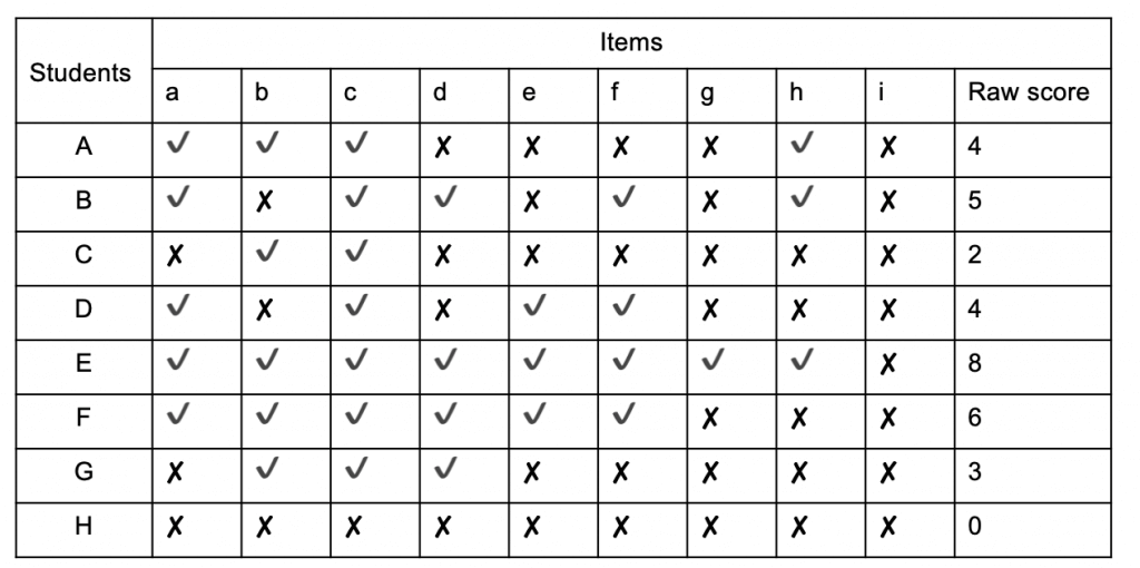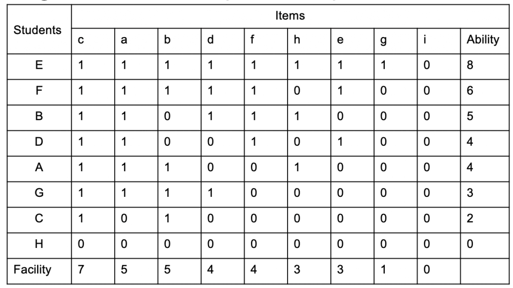 Table 2 - scalogram ranking student ability and item difficulty[/caption]By looking at this we can now see that students found item c the easiest, with 8 correct answers and item i the hardest with no correct answers. We also establish that we can learn very little from Student H's test performance from this data set alone. It may be that they were unable to answer any of the questions but, equally, it could be that they couldn't be bothered, we just can't tell. Back in the real world we might have all sorts of relevant knowledge about H, but none of that helps us to work out anything about item difficulty, so the best bet is to exclude H's results from our analysis. Likewise, there's little we can learn about the difficulty of item i. It could be that the questions so was tricky that none of the students were able to answer it, but it could also be that it represents part of the curriculum that has not yet been covered. If the same question was asked after a relevant teaching sequence, we might find that some, or all, of the students were able to answer it correctly, so again, we ought to exclude it from our analysis.