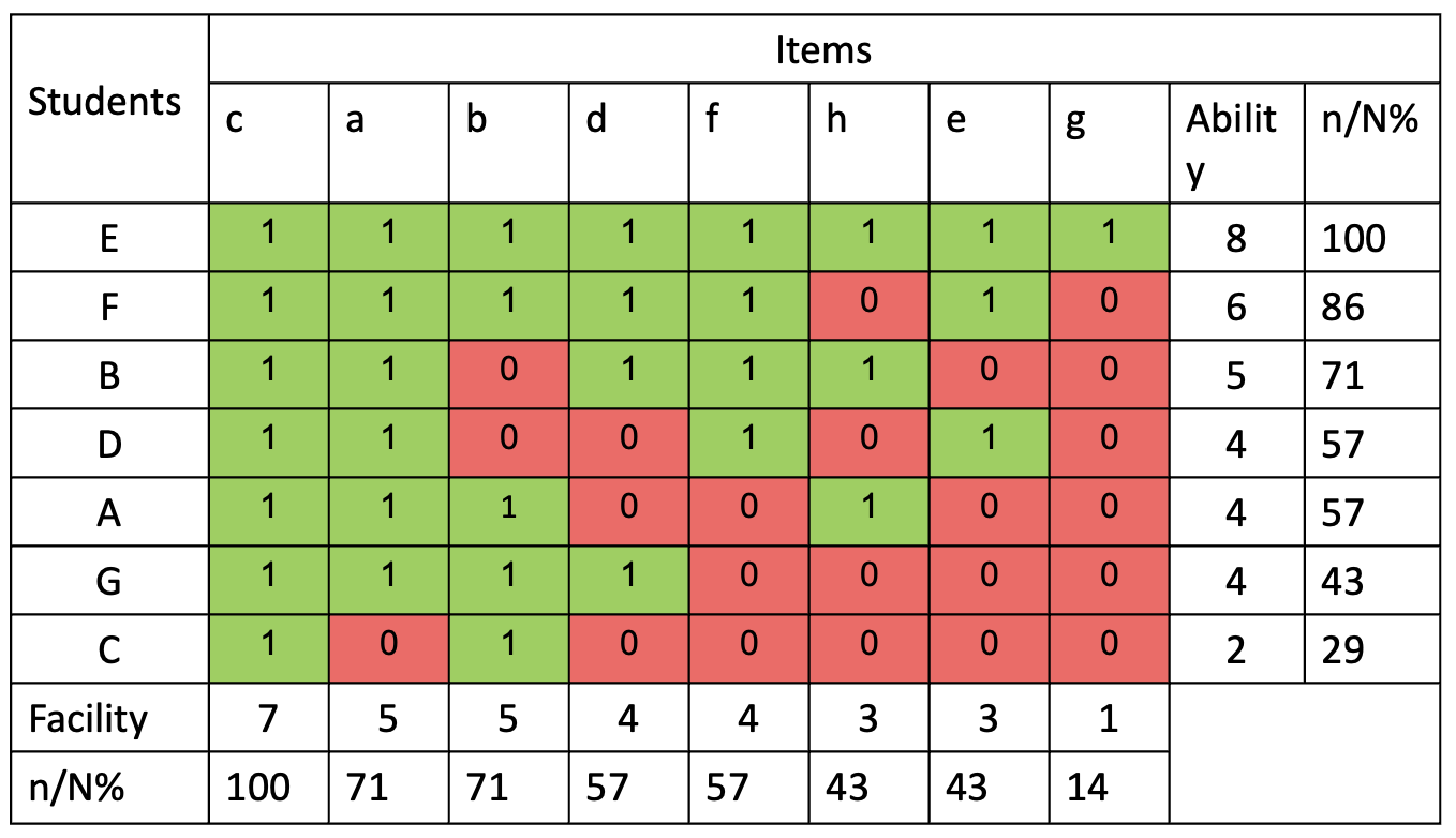 Table 1 - Summary of test data[/caption]Here we can see the performance of 8 students (A - H) in a test of 9 items (a - i). By totting up how many items each student answered correctly we can see that Student E did best with 8 correct answers and student H did worst with no correct answers. In order to find a signal amidst this noise it helps to reorder the test data in a scalogram: