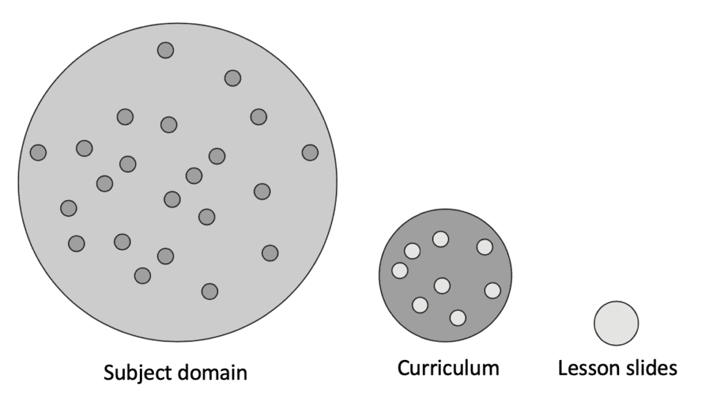 Planning a curriculum via PowerPoint is bad idea, even if you produce the best slides possible. We have to remember that the subject we’re teaching is a huge domain of knowledge. Our curriculum samples from that domain to give students access to powerful and culturally rich knowledge which they will be supported to use to make meaning. If we want students to have a meaningful experience of the curriculum, they need to see how ideas connect and branch beyond the limits of lessons. A lesson selects from a curriculum and seeks to distil complexity into a set of activities and actions that can take place within the confines of 50-60 minutes. There’s nothing wrong with the process per se, but it’s the action of having to select that leads to memorable and meaningful experiences. The problem with having lesson slides provided for you is that someone else has done that sampling and selecting for you. Unless we engage with as much of the domain – or at least as much of the curriculum – as possible before distilling content into a lesson we won’t know much about the content of that lesson ourselves and this can lead to teacher knowing little more than their students.