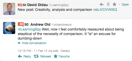 How much better is this than waltzing in with the question, “So, can anyone tell me what a simile is?” Anyone inclined to dismiss discovery learning as nonsense need look no further. The power of students discovering for themselves the point of a simile (or apostrophe, or subordinate clause or whatever) is much more likely to be memorable than their teacher just telling them.