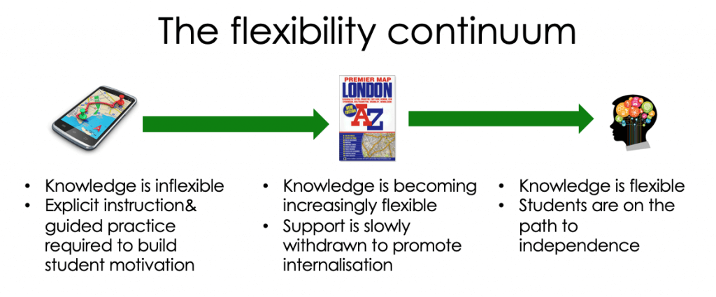 Inflexibility is a necessary foundation upon which more flexible structures can be built. When we apply inflexible knowledge, we make new schematic connections. We don’t just remember facts, we remember all the ways we’ve thought about and used those facts before. The more we apply knowledge, the ‘chunkier’ and increasingly flexible it becomes. Instead of looking at a problem and trying to hold all the steps in mind, we are able to think with the whole schema. Eventually, these schemas can be applied to examples which are less obviously similar because we are able to ignore the superficial differences and concentrate on the similarities. The journey from inflexibility to flexibility produces a positive feedback loop – changes are amplified and enhanced and the new, more expert, way of thinking becomes permanent.