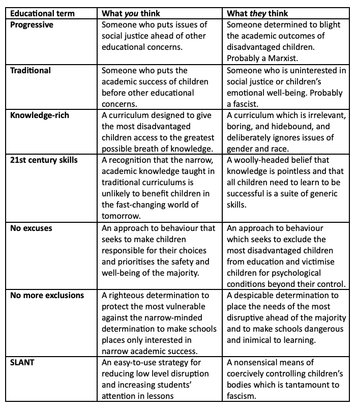 As in every sphere, there are certain phrases or topics that act as dog whistles in education. When people use terms like 'progressive,' 'knowledge-rich,' 'no excuses,' 'deep dive,' 'SLANT,' or 'fronted adverbial' they are tapping into a groundswell of - usually negative - opinion which stirs up like minded folk into predictable paroxysms of outrage and fury.What happens is, I think, something like this: for some people 'fronted adverbial' stands for soulless, mind numbing tedium and clunky, inelegant writing. For others, the term conjures up the thought that children are - at long last - receiving some of the much needed meta language which makes creativity easier to think about and put into practice. The same term sends wildly differing signals depending on the listener's lived experience and tribal affiliations. When I hear folk inveighing against fronted adverbials, my default setting is to recall my own, sadly lacking education and the fact that I was taught practically no grammar whilst at school. My tendency is to assume that the anti-fronted adverbial brigade are determined to cut children adrift from the tools they need to think critically and creatively about language. But, of course, I'm tilting at windmills. No one actually wants the thing I've set my face against. But, because neither me nor the poor person I launch a tirade against clearly spells out a position, assumptions are made, nose are put out of joint and bridges are burnt.