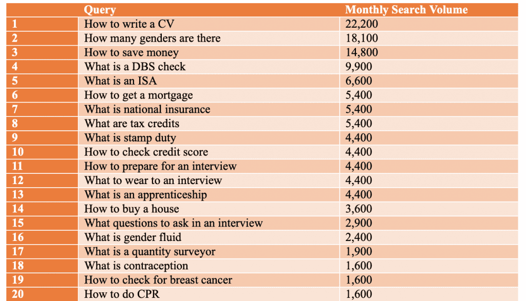 Many of the items on the above list are already taught in schools. Children are already taught to write CVs, prepare for job interviews and are given the basics about contraception, so why are they still looking these things up after they've left school? Maybe because they weren't paying attention? Maybe they weren't interested while they were still at school and only become interested when these things become relevant to them as adults?