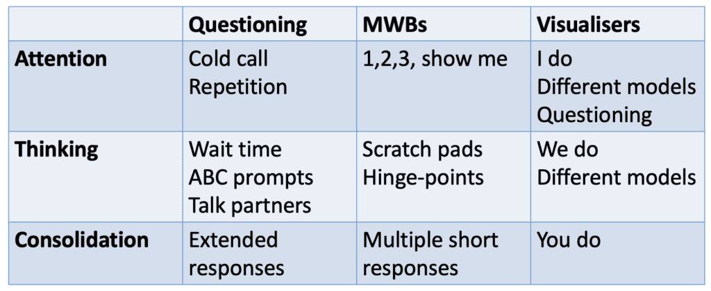 If we were to map 'turn & talk' onto this grid we'd need to ask ourselves what problem it would solve. So, does getting students to talk to each other help us to know whether they're all paying attention? No, not really. We can scan a room and get a rapid sense that all students are in engaged in talking but to find out whether they're talking about the thing we want them to talk about requires listening in to each individual conversation. We could of course wait until after the talk phase and cold call students to see if they have great contributions but all this really reveals is whether a student was definitely not attending. It's of little help in detecting whether those who are faster on their feet were actually on task. MWB routines and cold calling are better used as an efficient way to create a culture where students pay attention to you and each other.