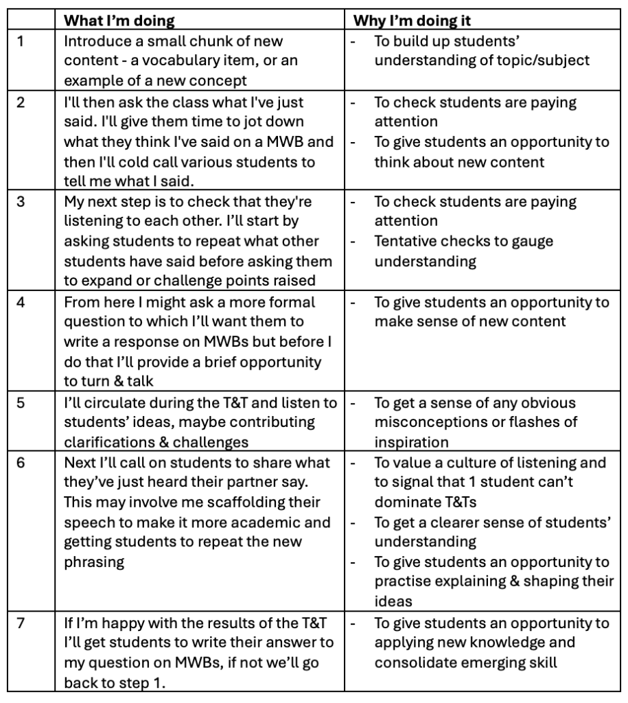 Beyond the notion that it's nice for students to chat, or 'do oracy,' is there any real merit in getting them to talk to each other during lessons?Recently on Twitter, Barry Smith got in touch to go over all the things he sees that regularly go wrong with 'turn & talk':