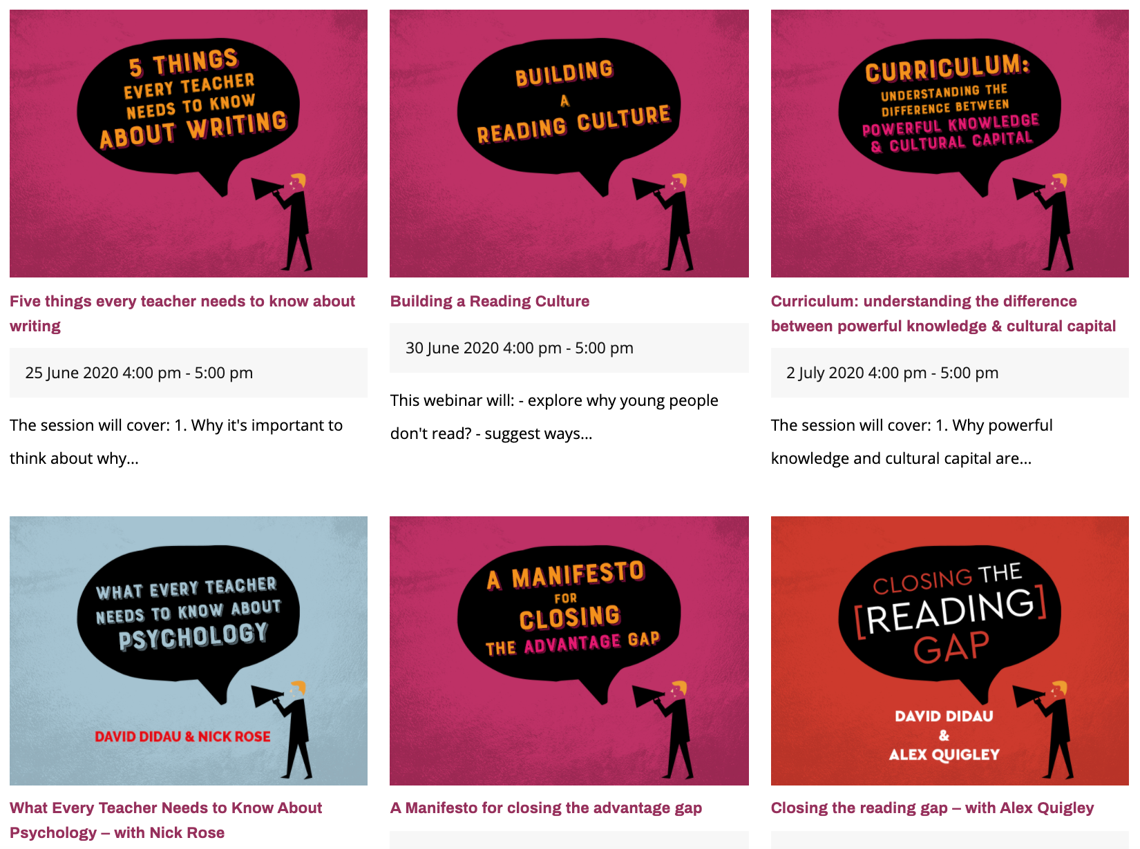 Last Thursday's inaugural webinar, 'Five things every teacher needs to know about reading,' was, on the whole, a great success. We sold out 1000 tickets and about 500 people showed up on the night. There were a few technical hiccups on the day including a power cut during set up, and our server going down when so many people tried to get into the webinar all at once. We also forgot to record the Q&A which was, arguably, the best bit. Never mind. We're going to run another - different - reading webinar on Tuesday 30th June at 4pm (BST): Building a Reading Culture.Your feedback will mean that this week's webinar on Thursday 25th June, Five things every teacher needs to know about writing, should be a lot smoother. The waiting room music will be changed in favour of something less offensively 'funky' and we'll do better with muting microphones etc.